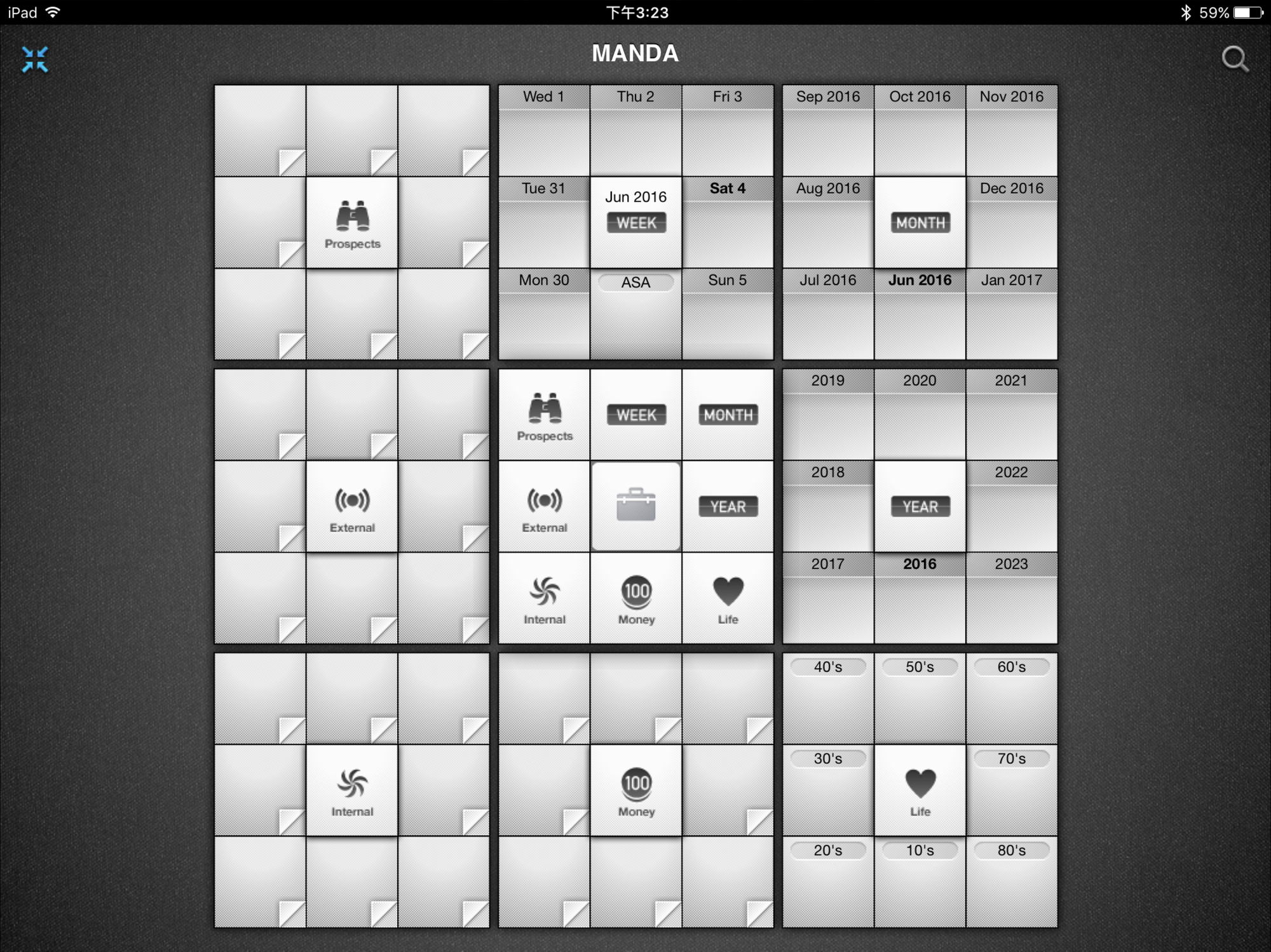 雖說我個人崇尚 Less is More,但是事情一多起來,對我造成選擇疲乏的焦慮感卻異常沈重,總覺得九宮格的曼陀羅筆記類型是適合我的,無奈字寫得少,所以練習也不多,但另一方面就讓我對九宮格類型的軟體更著迷了 0.0