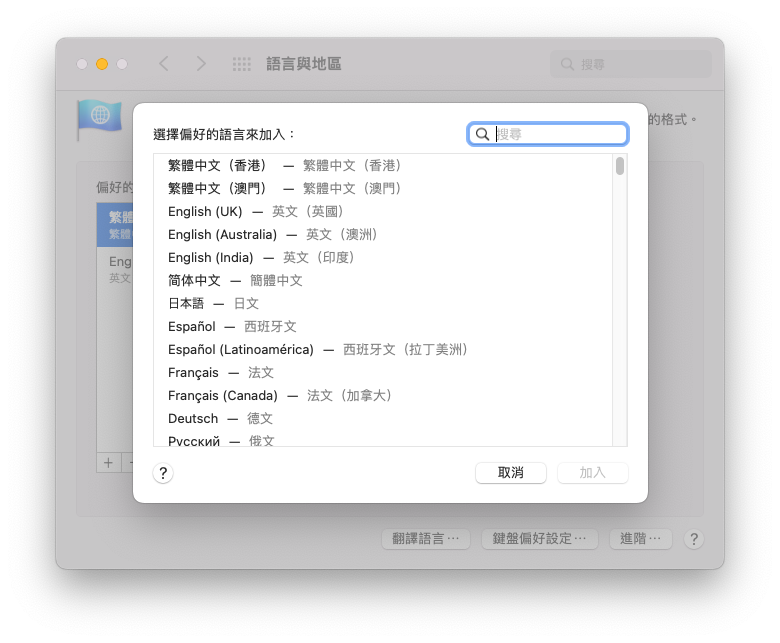 如果需要其他語系的話,也可以選擇面板左下方"+"按鈕,由此新增其他語系。完成後關閉視窗時,會提醒系統將會登出使用者。