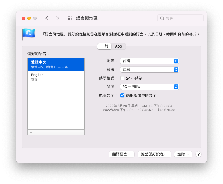 進到系統偏好設定中的「語言與地區」面板,畫面中左方的「偏好的語言」出現不只一種語言,是因為這裡的偏好是指優先「順序」之分,使用者可以自行調整語言的偏好順序,而以目前畫面為例,當軟體包含繁體中文語言包時,便會優先顯示繁體中文介面(比方作業系統包含繁體中文,於是目前顯示繁體中文),萬一沒有就顯示英文。