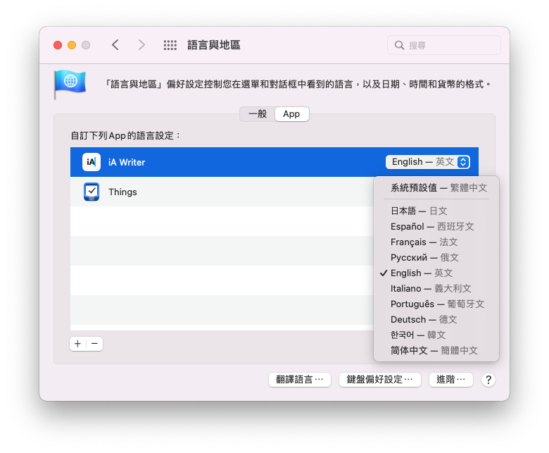 在系統偏好設定>語言與地區中的「App」標籤頁中,可以將特定 app 拖移到面板中,就可以個別設定該軟體的顯示語言。