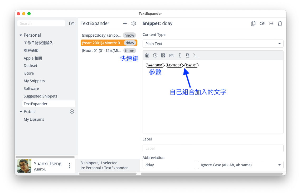 由於 TextExpender 可取得系統中的參數,簡單的比方日期或時間,內建的範例就很好用了。