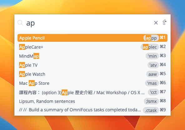 前面有提到萬一不常用的快速鍵,硬是沒記下來怎麼辦?你可以自行設定 inline Search 的快速鍵,預設的快速鍵是"command+/",當你想用卻忘記的快速鍵時,開啟像下圖的視窗,輸入一些文字就能找到,選擇之後就會替你展開,不會怕忘記。