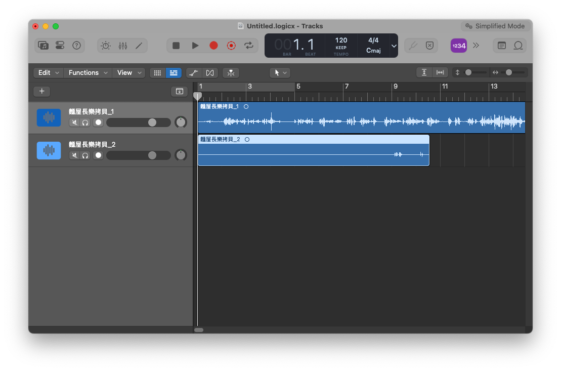 - 完成的語音備忘錄拖移到 Logic Pro 上同樣是分層的聲音檔(同樣的方式 GarageBand 似乎無法加入) 。